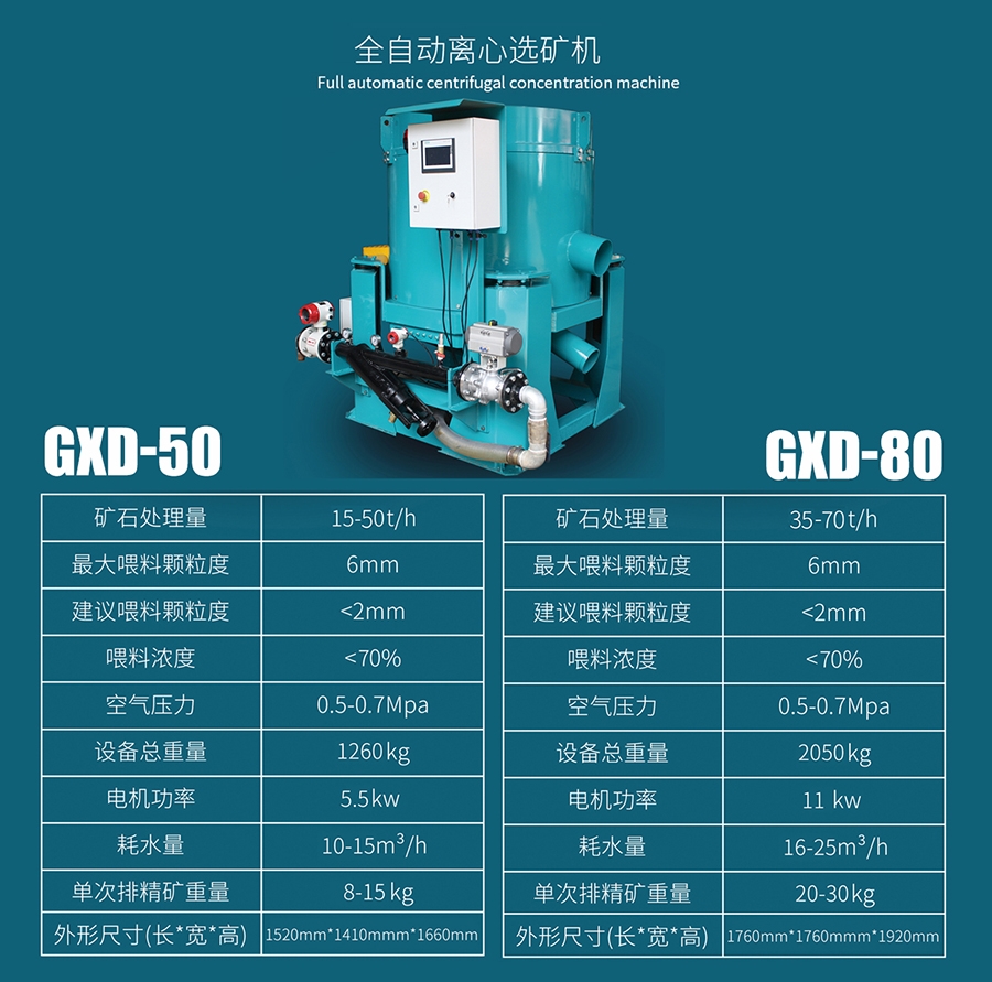 备注:1、自动排矿:设备在停机排出富集好的精矿时无需人工去清洗,而是设备自带清洗功能。新型离心机采用PLC编程、电脑设定排矿时间无需人工操作。